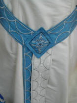 | Détails des broderies faites à la main de l'encolure, des manches et du motif central de la ceinture | ||
