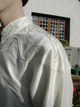 | Détails des broderies argentées et dorées, faites main, de l'encolure, de la pointe des manches intérieures et des manches médiévales. | ||