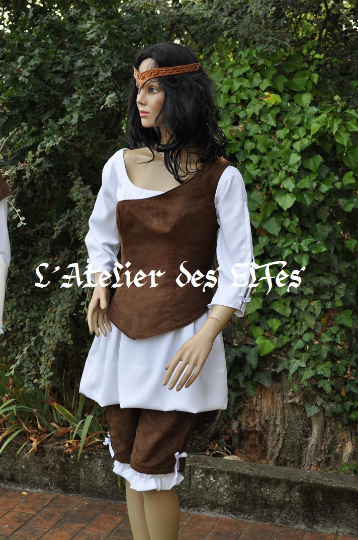 : - d'une chemise blanche avec col en V, manches bouffantes se terminant par un petit volant - d'une tunique en suédine marron, avec col romantique, bordé de galon blanc - d'une paire de canons d'avant-bras en cuir blanc Cliquez ici pour voir d'autres canons d'avant-bras |